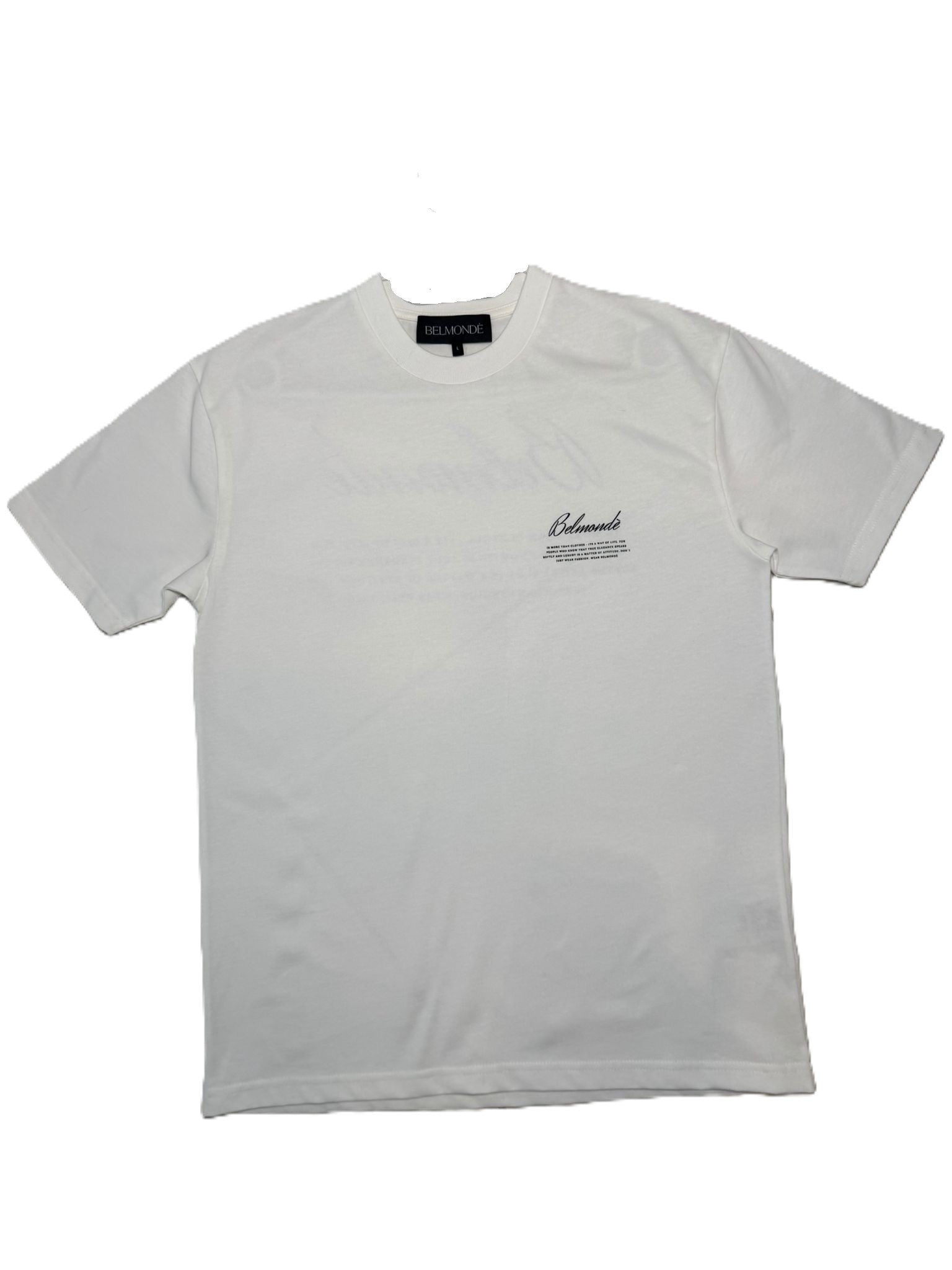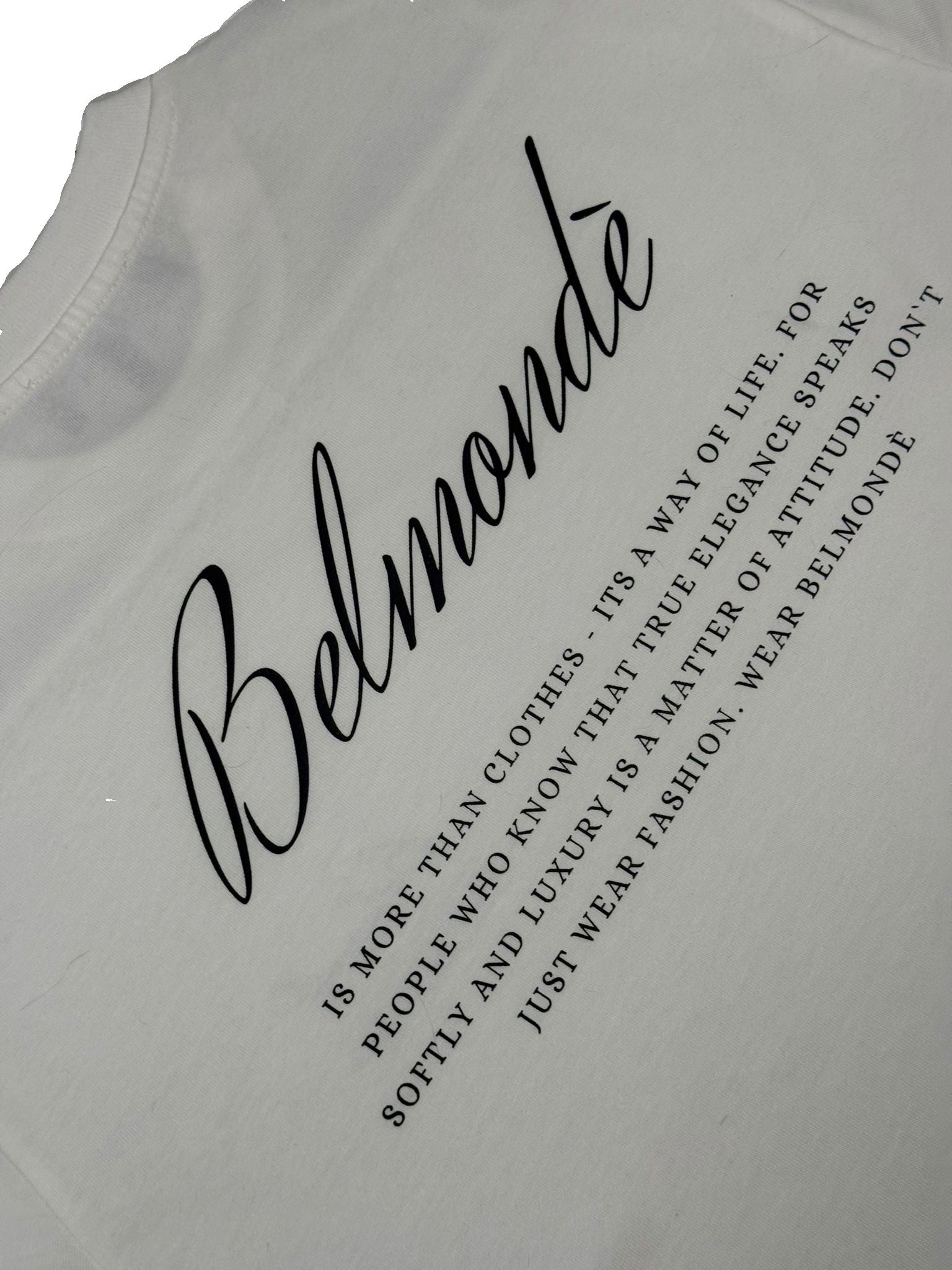 Dieses weißes T-Shirt aus 100% Baumwolle vereint Komfort und Stil. Der markante Backprint spiegelt die Identität von Belmondè wider und verleiht dem Shirt eine individuelle Note. Ideal für alle, die Wert auf hochwertige Materialien und ein ausdrucksstarkes Design legen.